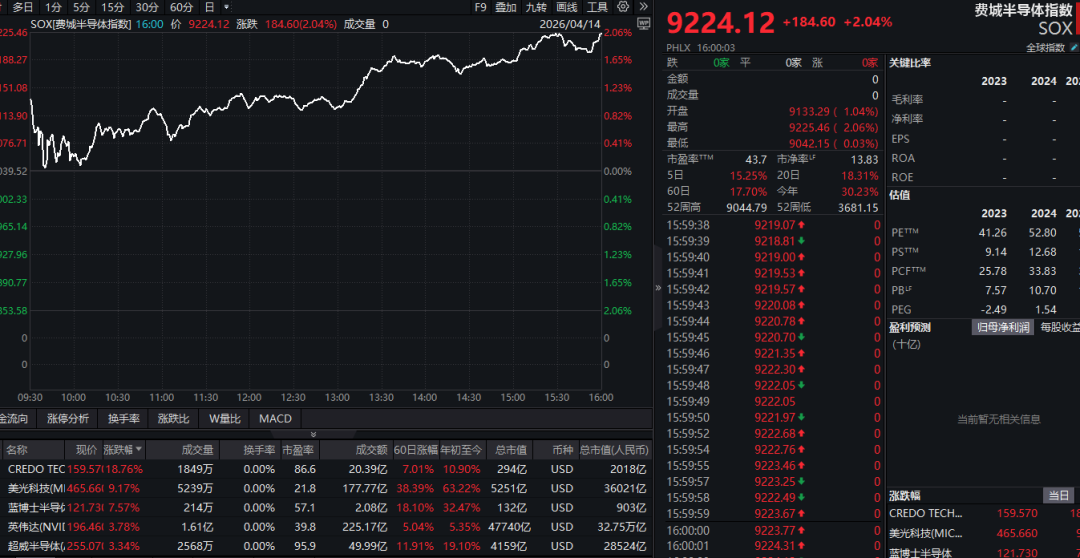值得注意的是,費(fèi)城半導(dǎo)體指數(shù)大漲2.04%,盤(pán)中創(chuàng)出歷史新高。