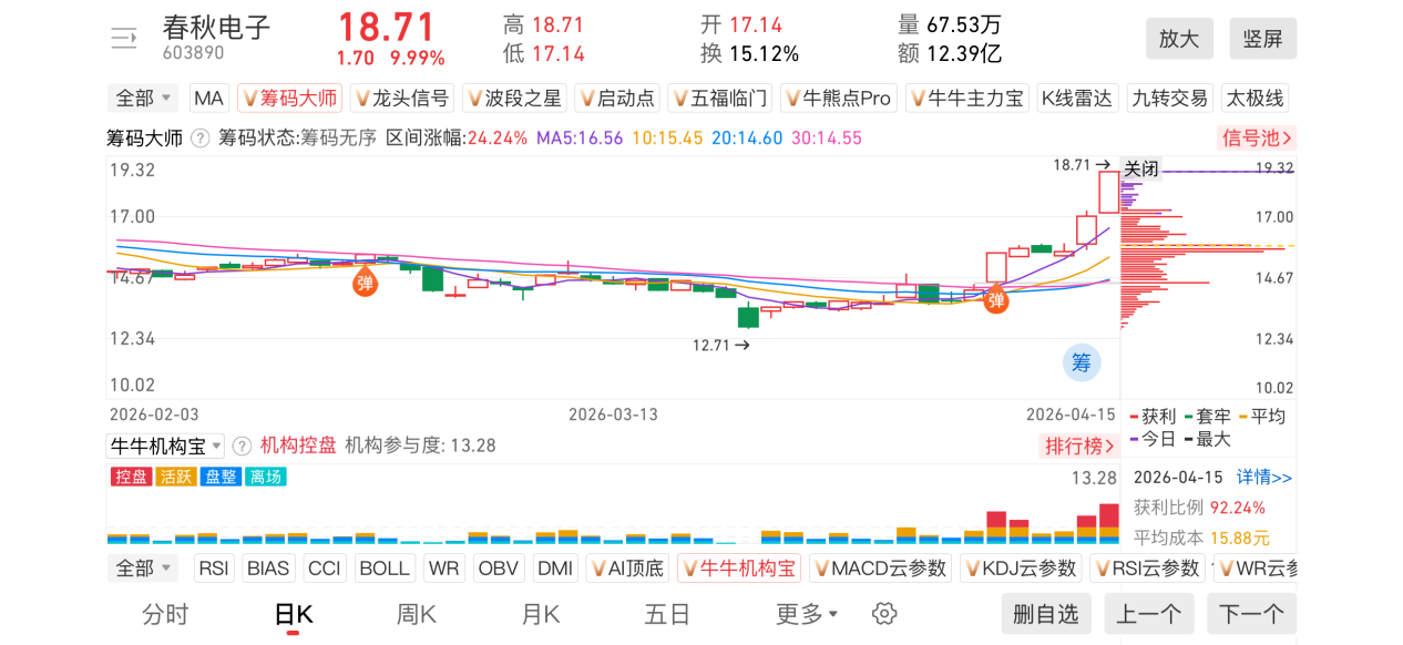 1)20260415-春秋電子-603890-【籌碼大師】和【牛牛機(jī)構(gòu)寶】-近期出現(xiàn)彈信號且底部量柱由綠轉(zhuǎn)紅