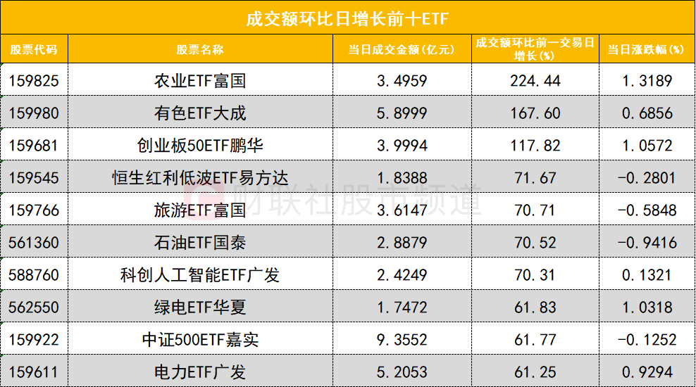 從成交額環(huán)比增長前十的ETF來看,農(nóng)業(yè)ETF富國(159825)成交額環(huán)比增長224%位居首位;有色ETF大成(159980)成交額環(huán)比增長167%位居次席。