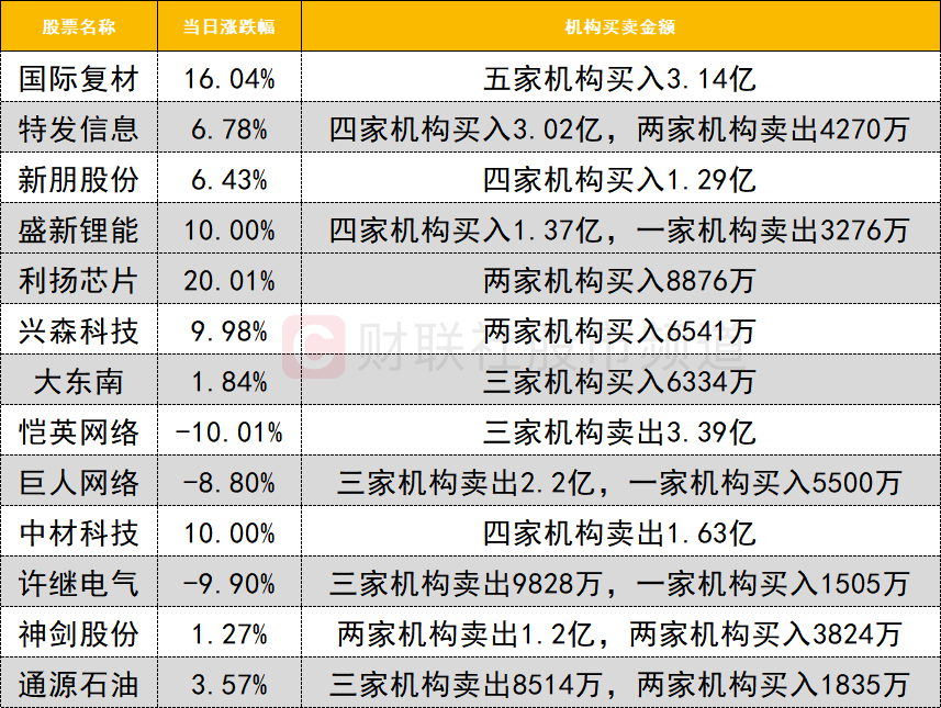 今日龍虎榜機(jī)構(gòu)活躍度明顯提升,玻纖概念集體爆發(fā),國際復(fù)材獲五家機(jī)構(gòu)買入3.14億,而中材科技遭四家機(jī)構(gòu)賣出1.63億。光纖人氣股特發(fā)信息低開高走,獲四家機(jī)構(gòu)買入3.02億,同時遭兩家機(jī)構(gòu)賣出4270萬。