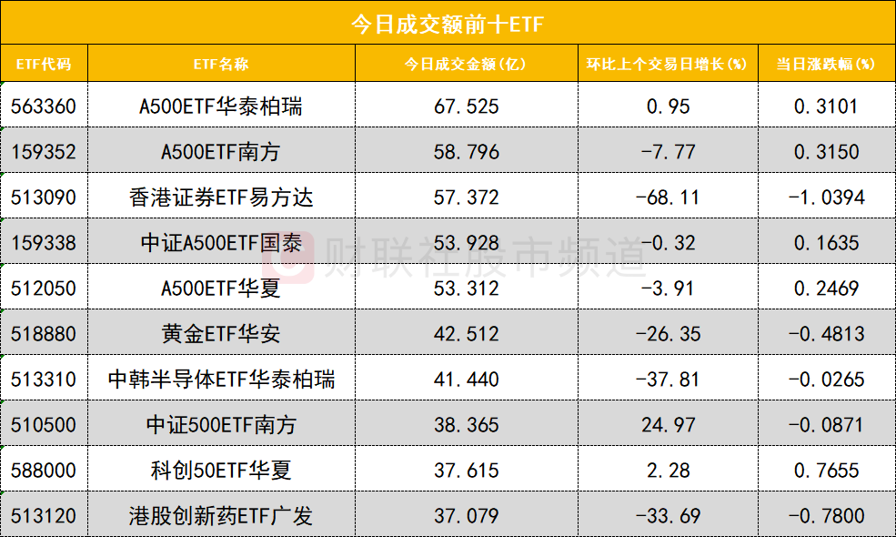 從成交額前十的ETF來看,A500ETF華泰柏瑞(563360)成交額位居首位,A500ETF南方(159352)成交額位居次席。