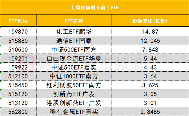 在上周份額增長前十ETF中,化工ETF鵬華(159870)上周份額增長14.87億份位居首位;通信ETF國泰(515880)上周份額增長12.045億份位居次席。