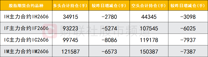 四大期指主力合約的多空雙方均減倉,其中IF、IM合約的空頭減倉數(shù)量較多。