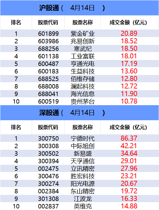 從滬股通前十大成交個股來看,紫金礦業(yè)位居首位;兆易創(chuàng)新和寒武紀(jì)分居二、三位。