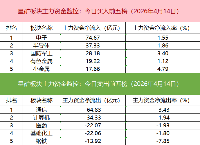 板塊資金流出方面,通信板塊主力資金凈流出居首。
