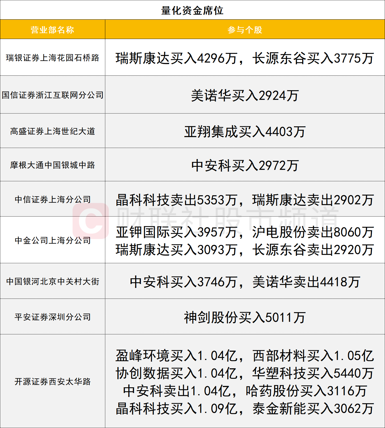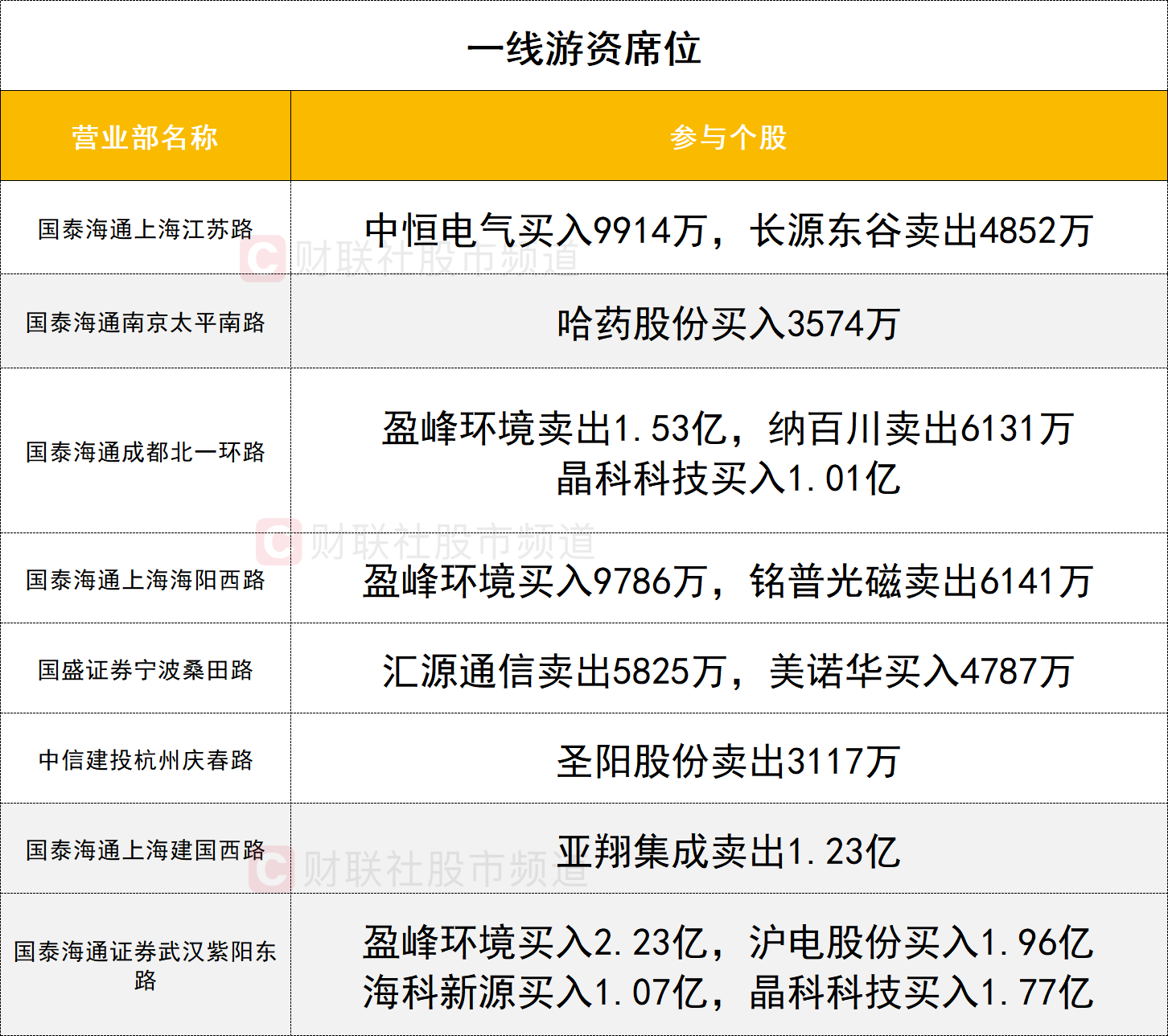 一線游資活躍度較高,滬電股份今日漲停創(chuàng)歷史新高,獲一家一線游資(國泰海通證券武漢紫陽東路)買入1.96億,同時深股通買入2.02億。游資扎堆盈峰環(huán)境,獲兩家游資(國泰海通證券武漢紫陽東路、國泰海通上海海陽西路)合計買入3.2億,同時一家游資(國泰海通成都北一環(huán)路)賣出1.53億。