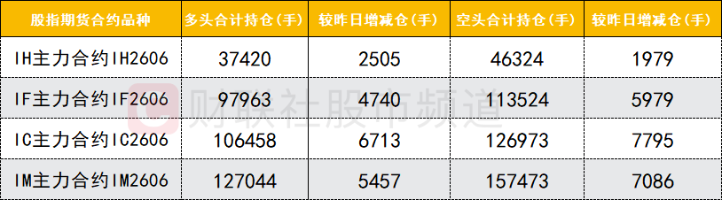 四大期指主力合約多空雙方均加倉,IF、IM合約空頭加倉數(shù)量較多。