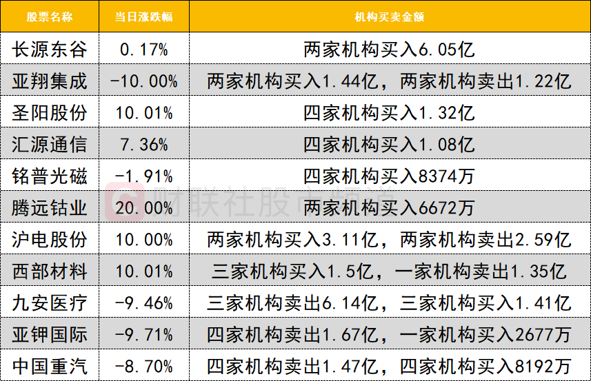 今日龍虎榜機(jī)構(gòu)活躍度較高,儲能概念股圣陽股份走出4連板,獲四家機(jī)構(gòu)買入1.32億。算力硬件方向獲機(jī)構(gòu)青睞,其中匯源通信獲四家機(jī)構(gòu)買入1.08億;銘普光磁獲四家機(jī)構(gòu)買入8374萬;滬電股份獲兩家機(jī)構(gòu)買入3.11億,同時遭兩家機(jī)構(gòu)賣出2.59億。長源東谷獲兩家機(jī)構(gòu)大幅買入6.05億。
