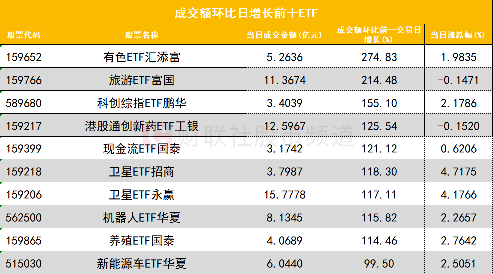 從成交額環(huán)比增長前十的ETF來看,有色ETF匯添富(159652)成交額環(huán)比增長274%位居首位;旅游ETF富國(159766)成交額環(huán)比增長214%位居次席。
