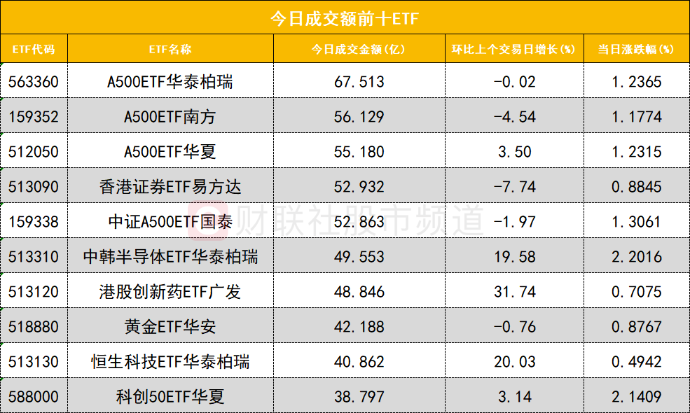 從成交額前十的ETF來看,A500ETF華泰柏瑞(563360)成交額位居首位,A500ETF南方(159352)成交額位居次席。