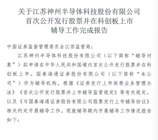 輔導(dǎo)工作完成報(bào)告顯示,神州半導(dǎo)體擬申請(qǐng)IPO并在科創(chuàng)板上市。據(jù)悉,該公司2025年12月17日向江蘇證監(jiān)局提交IPO輔導(dǎo)備案,輔導(dǎo)工作歷時(shí)約3個(gè)半月。