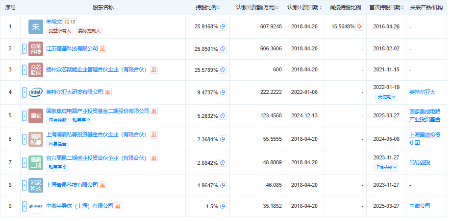 除朱培文之外,工商信息顯示,神州半導(dǎo)體股東列表還包括英特爾亞太研發(fā)有限公司、國(guó)家集成電路產(chǎn)業(yè)投資基金二期股份有限公司、上海浦宸私募投資基金合伙企業(yè)(有限合伙)、宜興高易二期創(chuàng)業(yè)投資合伙企業(yè)(有限合伙)、上海巖泉科技有限公司、中微半導(dǎo)體(上海)有限公司,持股比例分別為9.47%、5.26%、2.37%、2.08%、1.96%、1.5%。