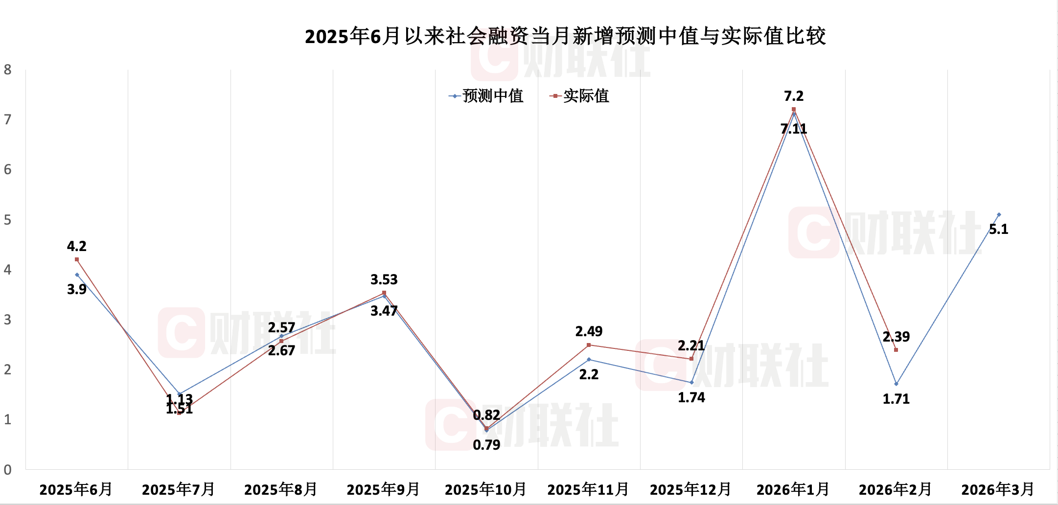 本期調(diào)查顯示,市場(chǎng)機(jī)構(gòu)對(duì)3月新增社融規(guī)模預(yù)測(cè)中值為5.1萬(wàn)億元,較2025年同期5.89萬(wàn)億元少增0.79萬(wàn)億元,參與機(jī)構(gòu)預(yù)測(cè)區(qū)間為4.61萬(wàn)億至5.45萬(wàn)億元。