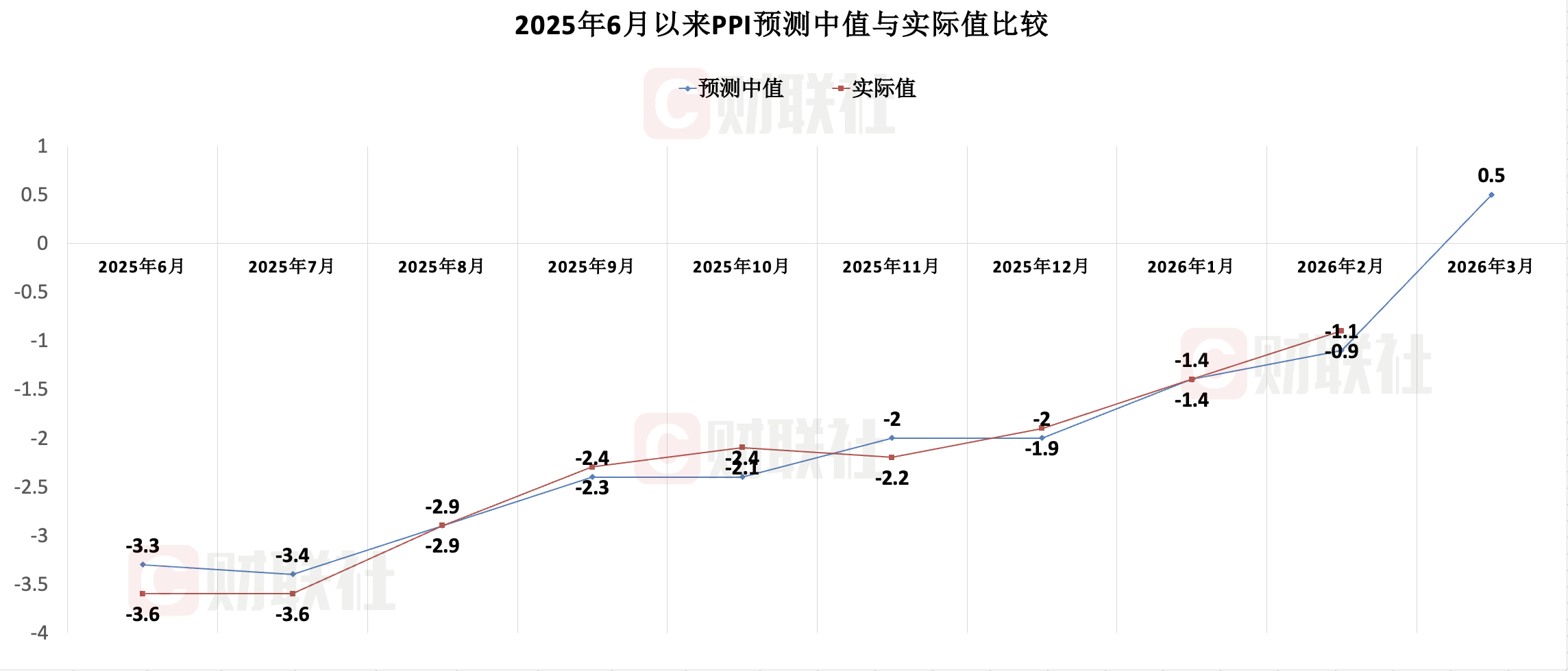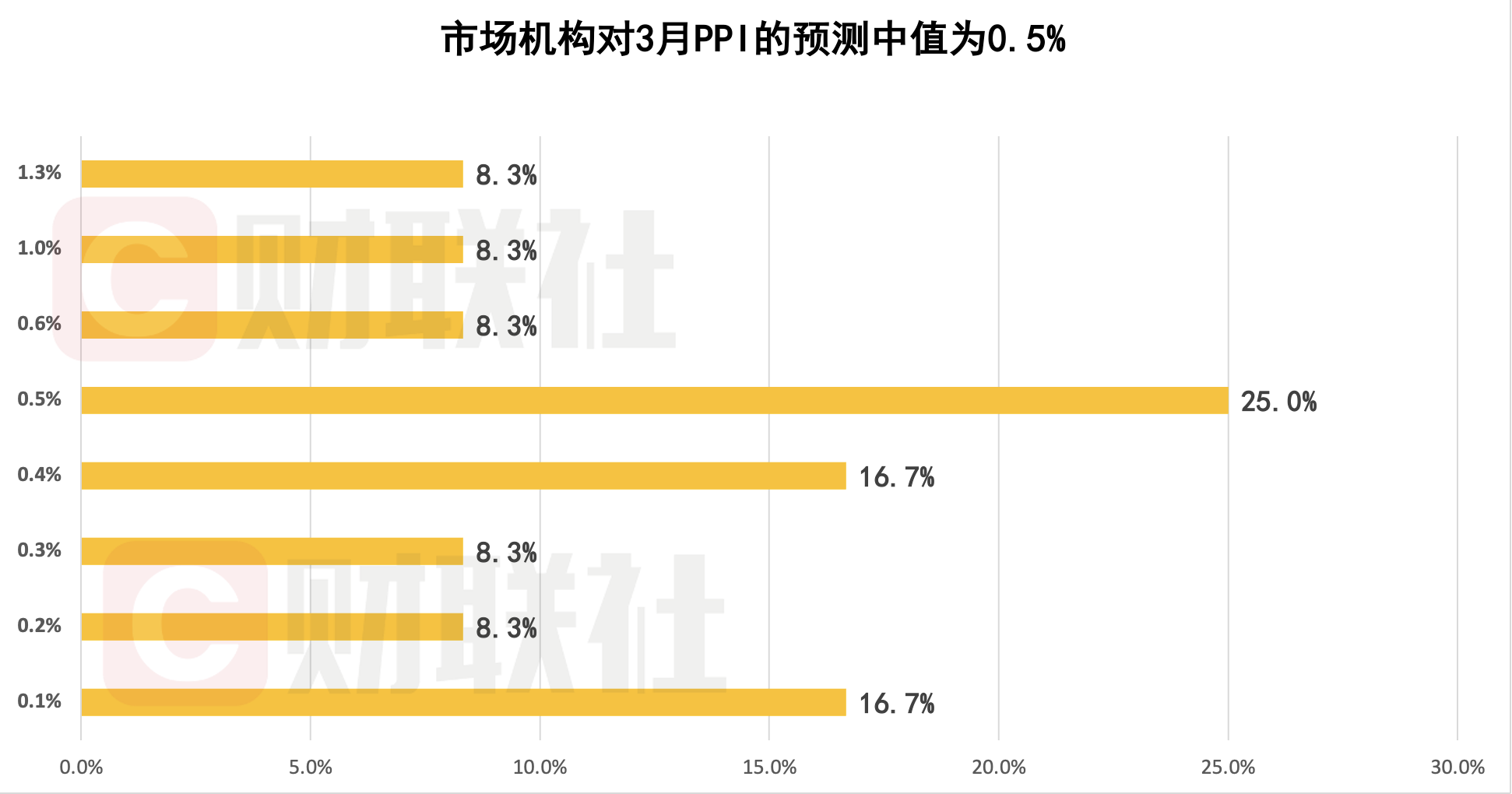 PPI方面,市場(chǎng)普遍預(yù)計(jì),在原油價(jià)格上漲推動(dòng)下,3月PPI同比有望轉(zhuǎn)正。具體來(lái)看,市場(chǎng)機(jī)構(gòu)對(duì)3月PPI的預(yù)測(cè)中值為0.5%,預(yù)測(cè)區(qū)間為0.1%至1.3%。