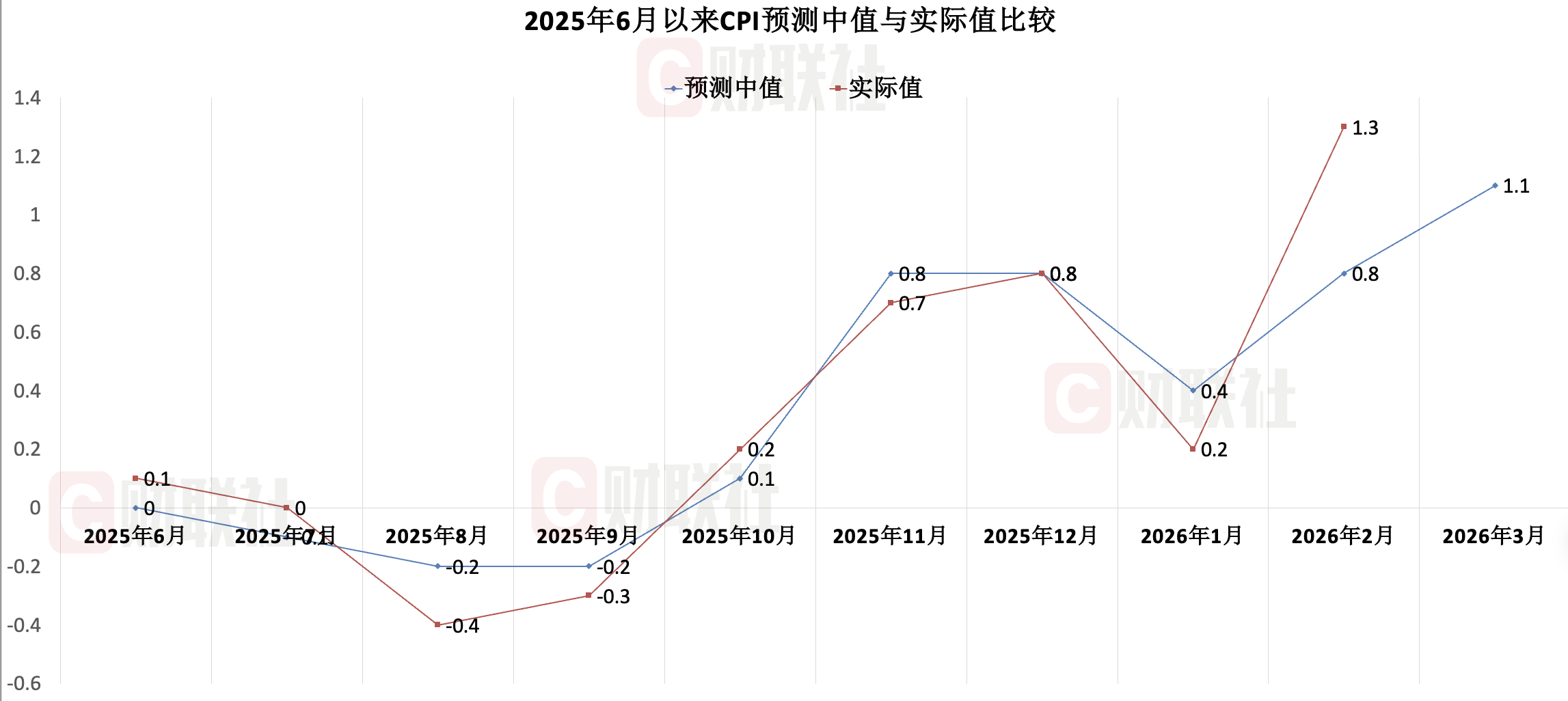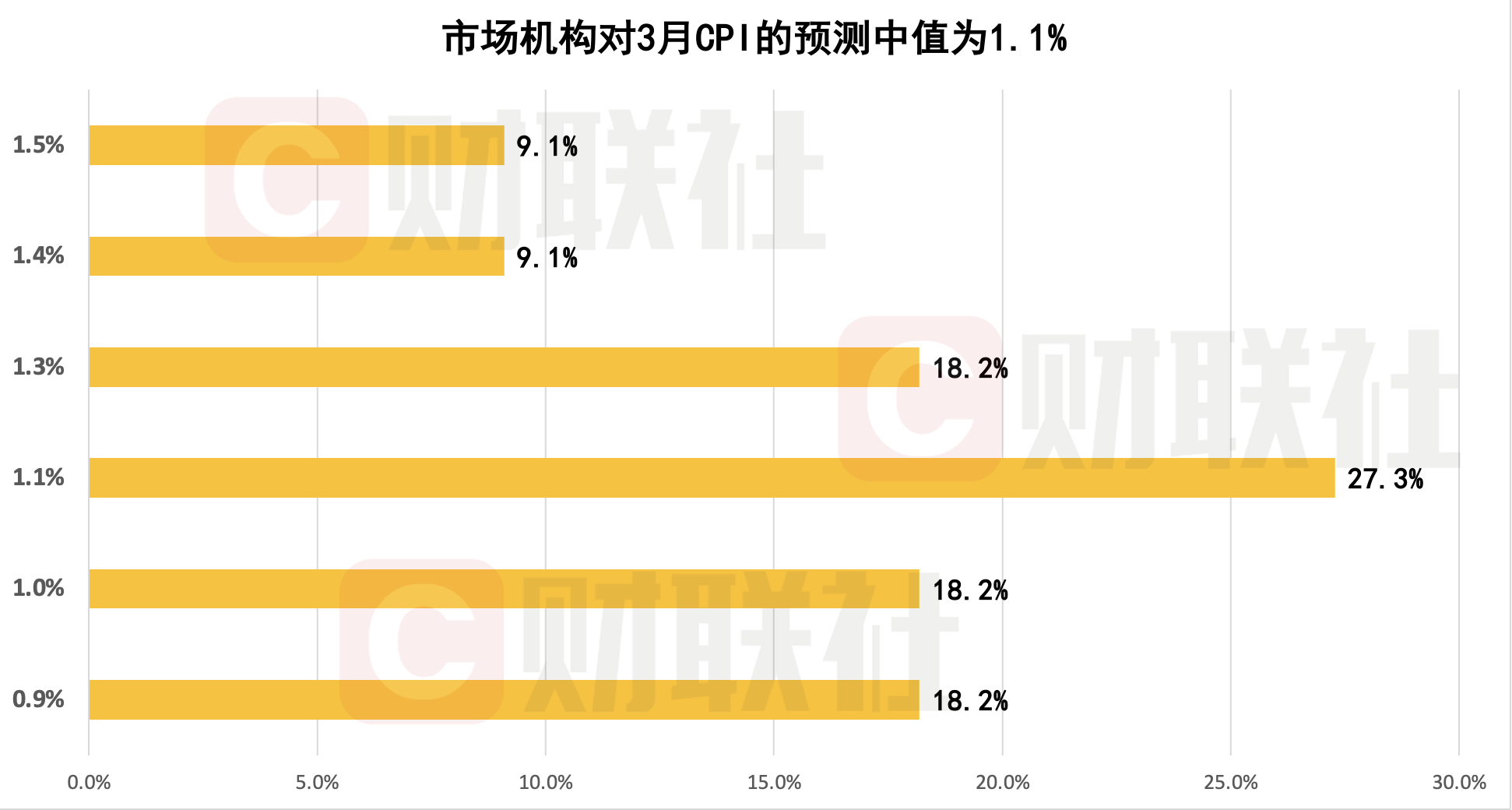從同比讀數(shù)來(lái)看,市場(chǎng)預(yù)計(jì)春節(jié)效應(yīng)淡去,3月CPI同比或小幅回落。具體來(lái)看,市場(chǎng)機(jī)構(gòu)對(duì)3月CPI的預(yù)測(cè)中值為1.1%,預(yù)測(cè)區(qū)間為0.9%至1.5%。