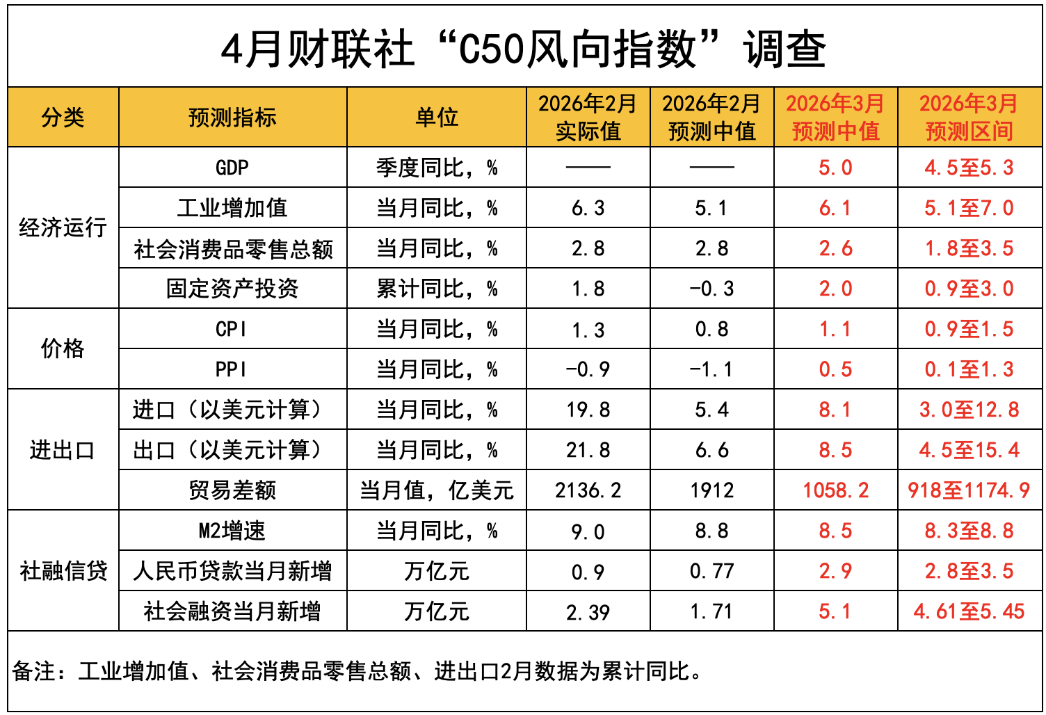 C50風(fēng)向指數(shù)調(diào)查:3月新增信貸及社融或同比少增,M2同比增速或小幅回落
