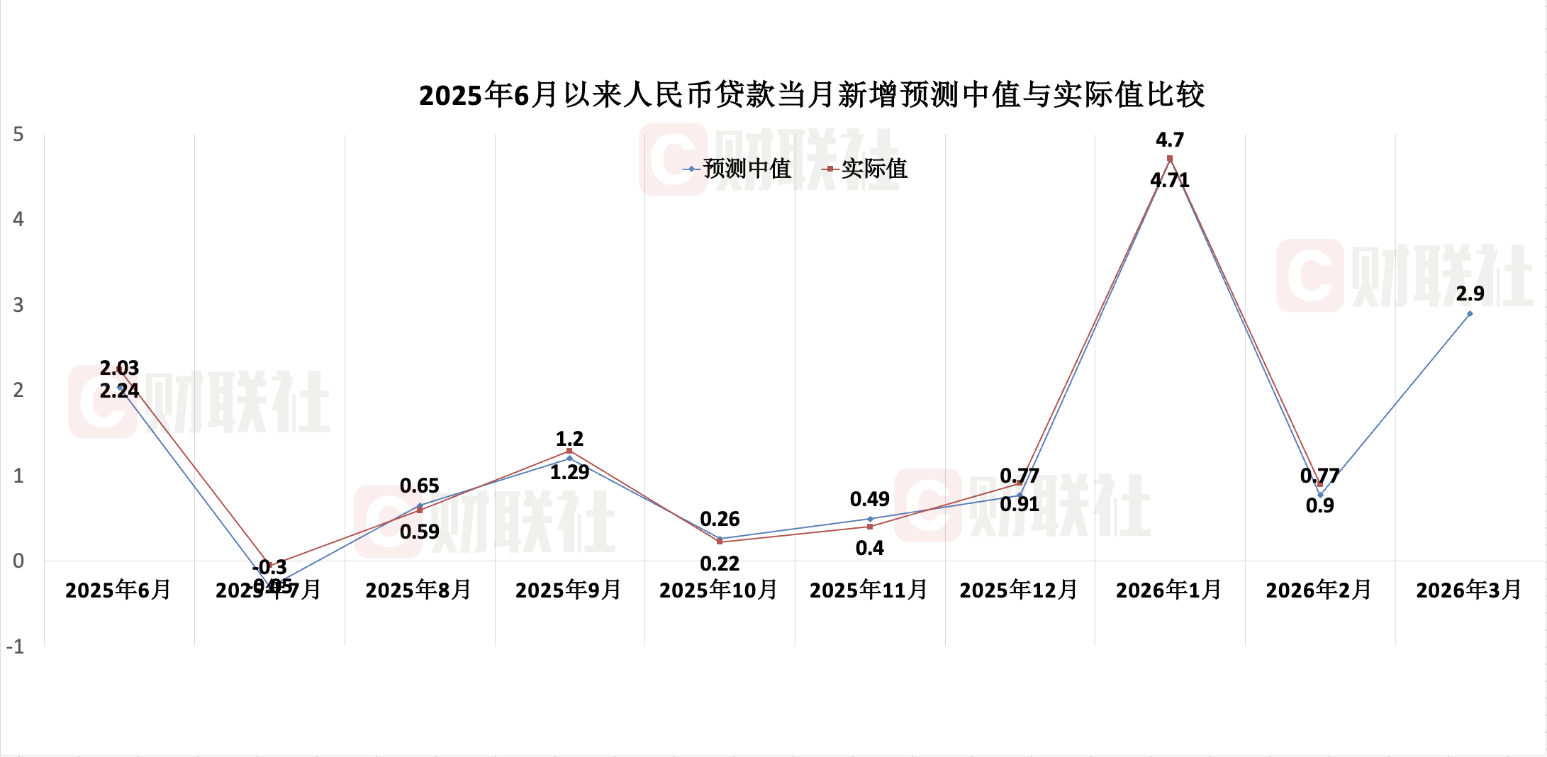 本期調(diào)查結(jié)果顯示,市場(chǎng)機(jī)構(gòu)對(duì)3月新增新增人民幣貸款的預(yù)測(cè)中值為2.9萬(wàn)億元,較2025年同期3.64萬(wàn)億元少增0.74萬(wàn)億元,預(yù)測(cè)區(qū)間為2.8萬(wàn)億至3.5萬(wàn)億元。