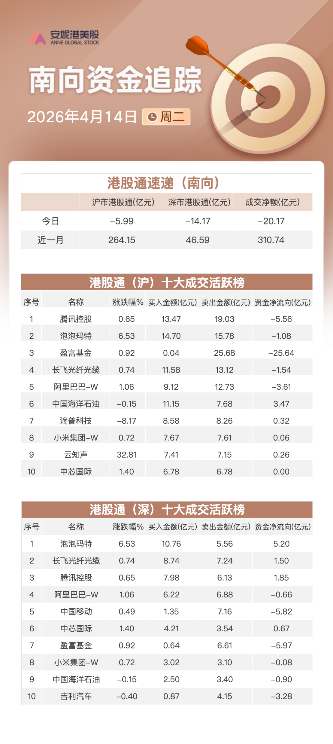 大幅凈流出:中國移動(00941.HK)5.82億港元;阿里巴巴-W(09988.HK)4.28億港元;騰訊控股(0700.HK)3.71億港元。