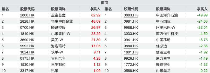大幅凈賣出:中國海洋石油(00883.HK)49.99億港元;中芯國際(00981.HK)24.63億港元;阿里巴巴-W(09988.HK)22.01億港元。