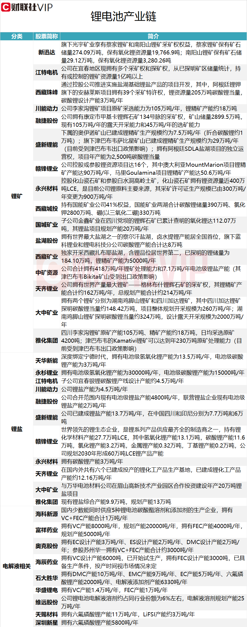 據(jù)VIP盤中寶?數(shù)據(jù)欄目此前梳理,鋰電池產(chǎn)業(yè)鏈中,鋰礦產(chǎn)業(yè)涉及的上市公司包括新迅達(dá)、江特電機(jī)、西藏珠峰、川能動(dòng)力、融捷股份、盛新鋰能、贛鋒鋰業(yè)、永興材料、西藏城投、國(guó)城礦業(yè)、鹽湖股份、西藏礦業(yè)、中礦資源、天齊鋰業(yè)、大中礦業(yè)、雅化集團(tuán),具體情況詳見(jiàn)下圖: