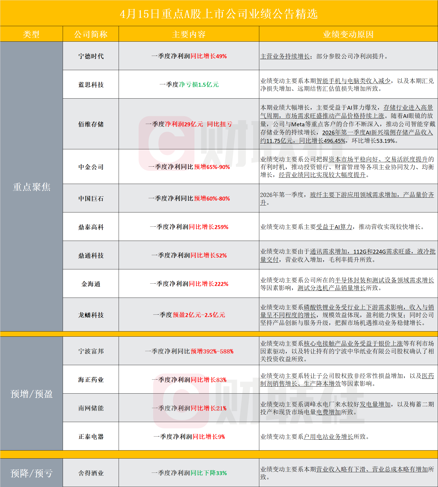 【盤后A股上市公司重點(diǎn)業(yè)績(jī)公告精選】財(cái)聯(lián)社4月15日電,據(jù)財(cái)聯(lián)社不完全統(tǒng)計(jì),截至發(fā)稿,盤后包括寧德時(shí)代、藍(lán)思科技、佰維存儲(chǔ)、中金公司、中國(guó)巨石、鼎泰高科、鼎通科技、金海通、龍?bào)纯萍?、寧波富邦、海正藥業(yè)、南網(wǎng)儲(chǔ)能、正泰電器、舍得酒業(yè)在內(nèi)的多家A股上市公司發(fā)布2026年一季度業(yè)績(jī)預(yù)告/報(bào)告。其中,寧德時(shí)代公告,一季度凈利潤(rùn)同比增長(zhǎng)49%。小財(cái)注:吉比特、申通快遞昨日盤后發(fā)布一季度業(yè)績(jī)預(yù)告,今日均收盤漲停。