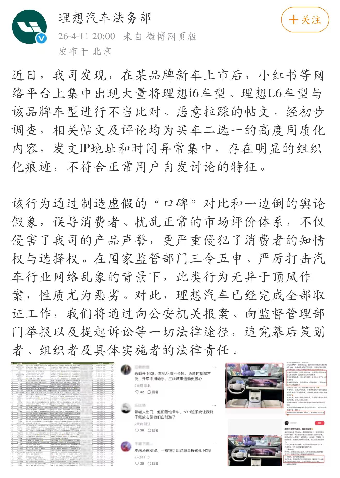 該行為通過制造虛假的“口碑”對比和一邊倒的輿論假象,誤導(dǎo)消費者、擾亂正常的市場評價體系,不僅侵害了我司的產(chǎn)品聲譽(yù),更嚴(yán)重侵犯了消費者的知情權(quán)與選擇權(quán)。在國家監(jiān)管部門三令五申、嚴(yán)厲打擊汽車行業(yè)網(wǎng)絡(luò)亂象的背景下,此類行為無異于頂風(fēng)作案,性質(zhì)尤為惡劣。對此,理想汽車已經(jīng)完成全部取證工作,我們將通過向公安機(jī)關(guān)報案、向監(jiān)督管理部門舉報以及提起訴訟等一切法律途徑,追究幕后策劃者、組織者及具體實施者的法律責(zé)任。